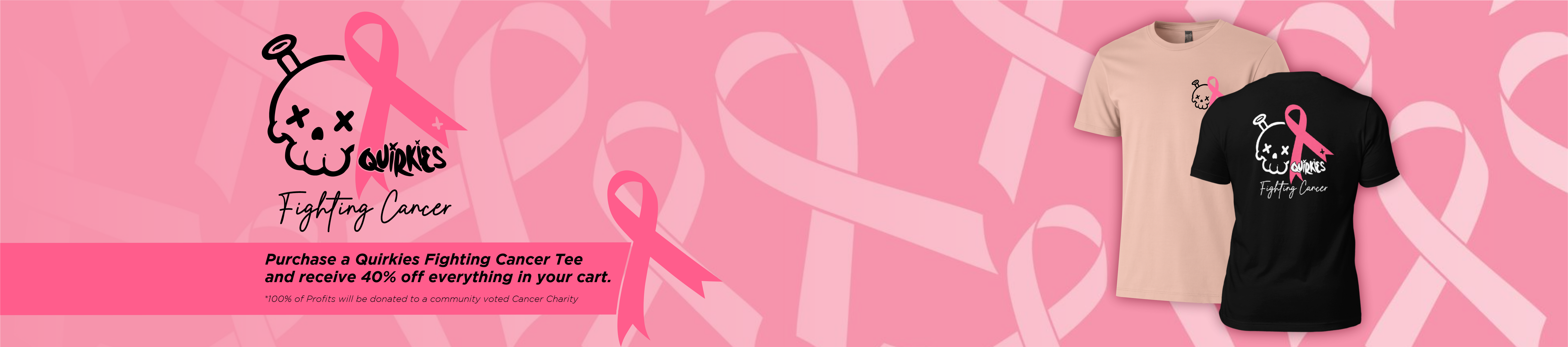 By putting a Quirk Fighting Cancer t-shirt in the cart you will receive a 40% discount on the remaining items in your cart, (cancer shirt is not discounted),